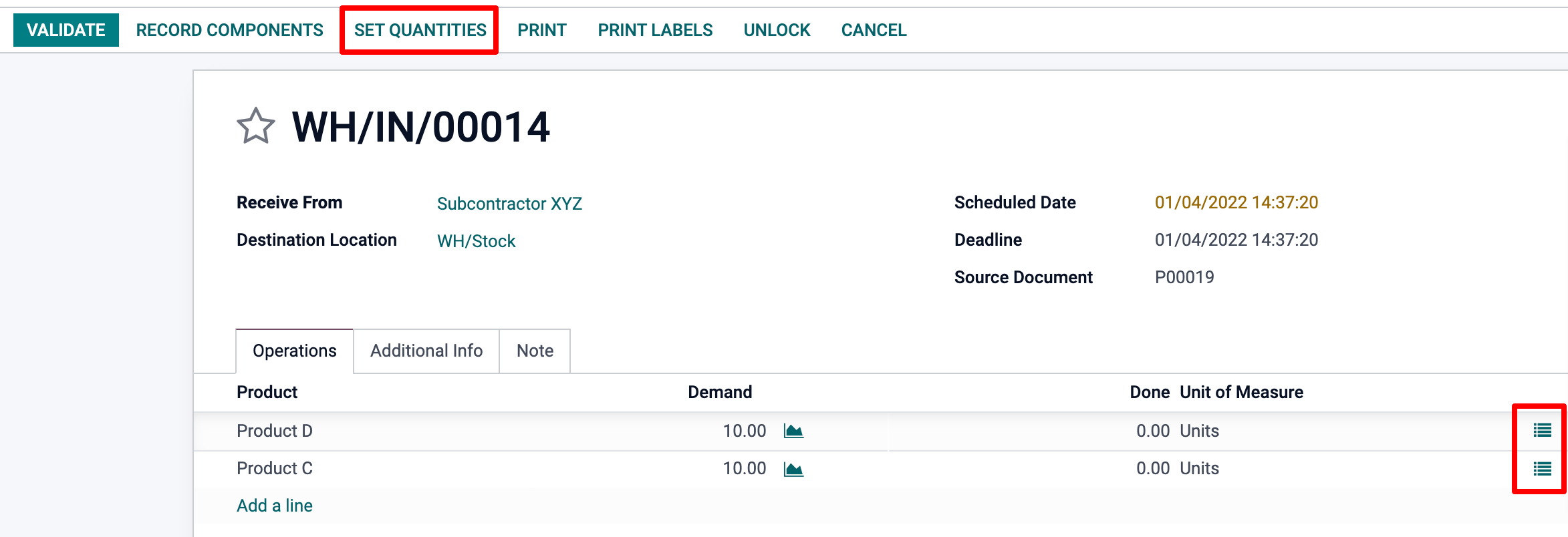 In case the received products from the subcontractor contain tracked components, their serial or lot numbers need to be specified during the receipt.