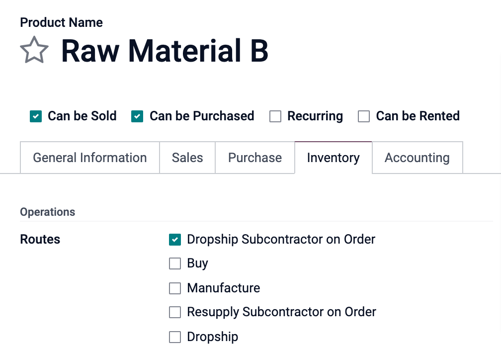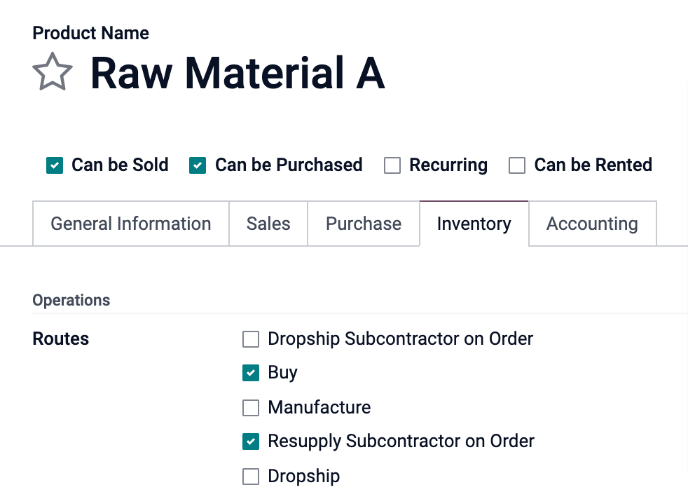 If you are supplying your subcontractor with raw material from your own warehouse, you must activate the ‘Resupply Subcontractor on Order’ route as shown below. If this is a component that you buy from a vendor, the buy route should also be activated.